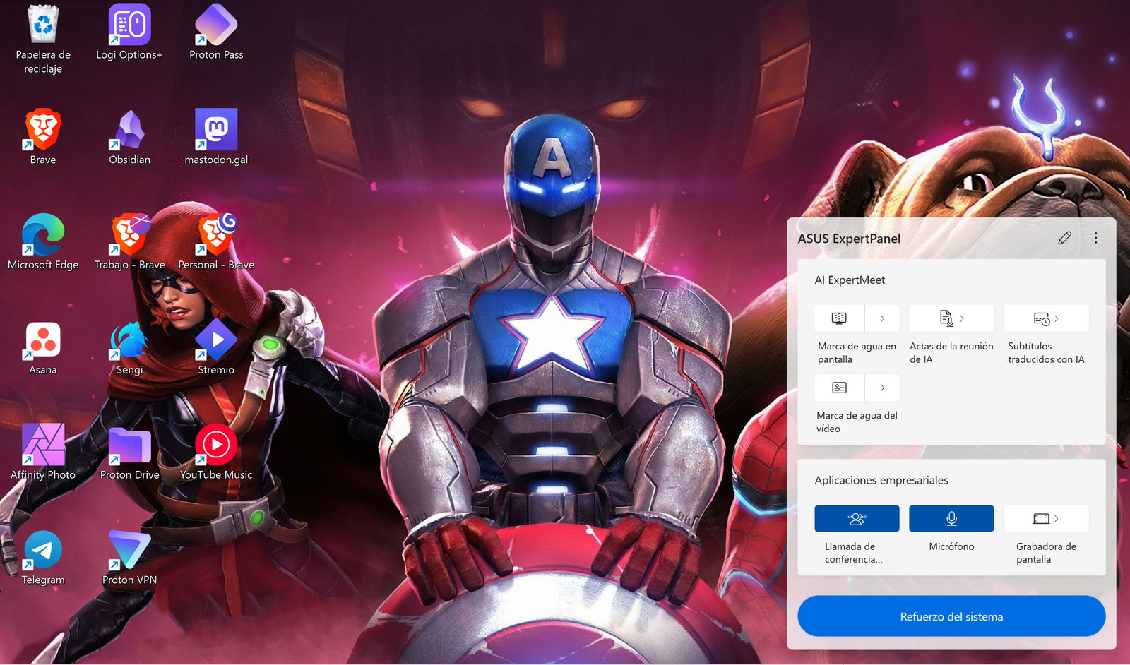 La segunda de las aplicaciones nativas que viene instalada por defecto en el ASUS Expertbook P5 es ASUS ExpertPanel, un widget integrado en la barra de tareas de Windows desde el cual vas a poder habilitar la cancelación de ruido con IA en llamadas y videollamadas, activar o desactivar el micrófono y lanzar la grabadora de pantalla. Además, este widget también te da acceso a la aplicación "AI ExpertMeet", gracias a la cual vas a poder ver subtítulos traducidos con IA, poner una marca de agua en la pantalla o en un vídeo compartido en una reunión e incluso crear actas de una reunión usando la Inteligencia Artificial.