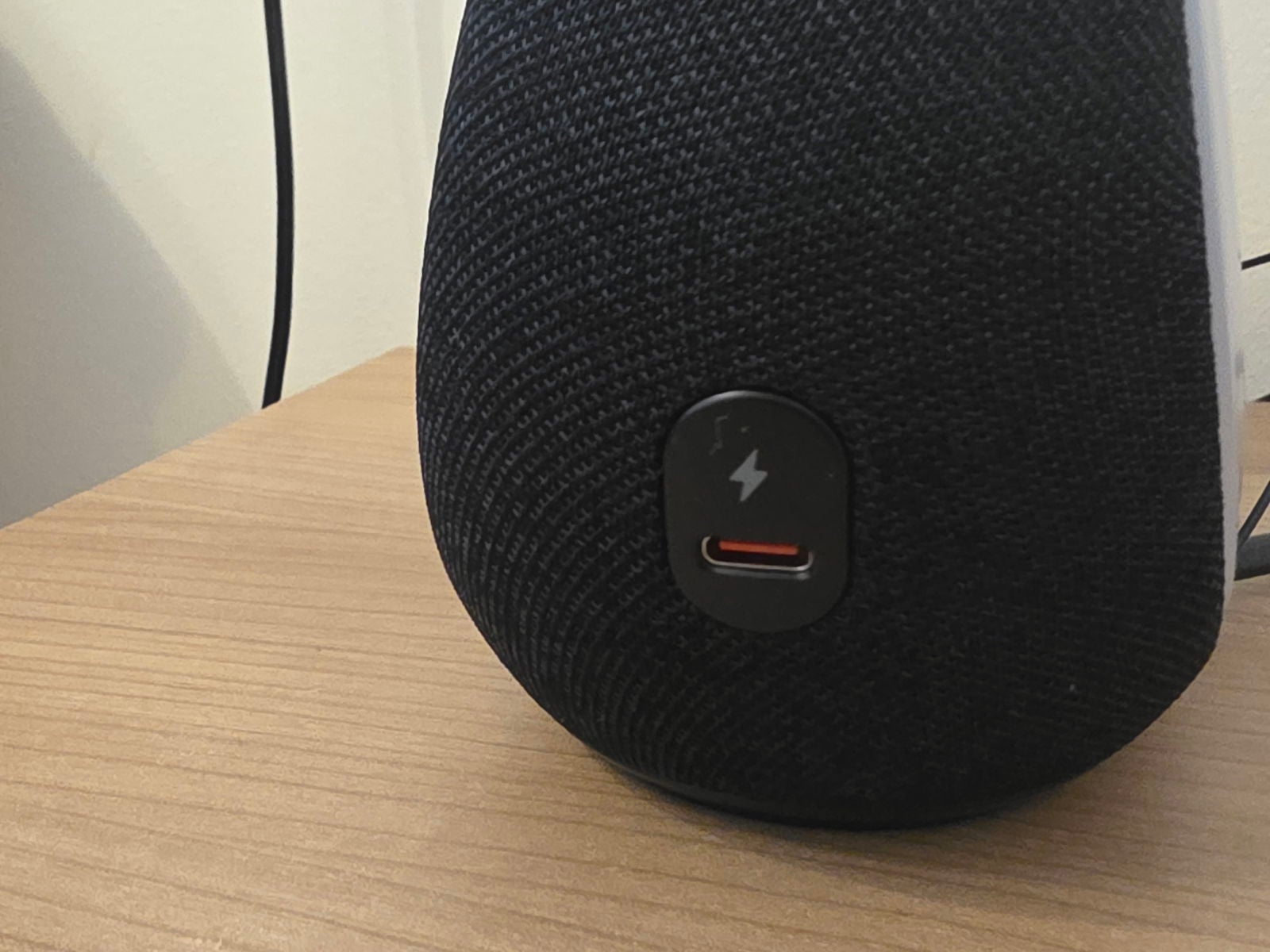El primer contacto visual es sorprendente. Nada más ver el JBL Horizon 3, lo que más llama la atención es esa forma ovalada, casi como una píldora elegante que se aleja por completo de los típicos despertadores cuadrados y aburridos. El acabado en negro mate con esa rejilla textil que cubre casi toda la superficie frontal le da un aire sofisticado que no desentonaría en absoluto en una mesa de despacho o en cualquier salón moderno. Cuando lo colocas en la mesita de noche, enseguida te das cuenta de que este no es un despertador cualquiera.