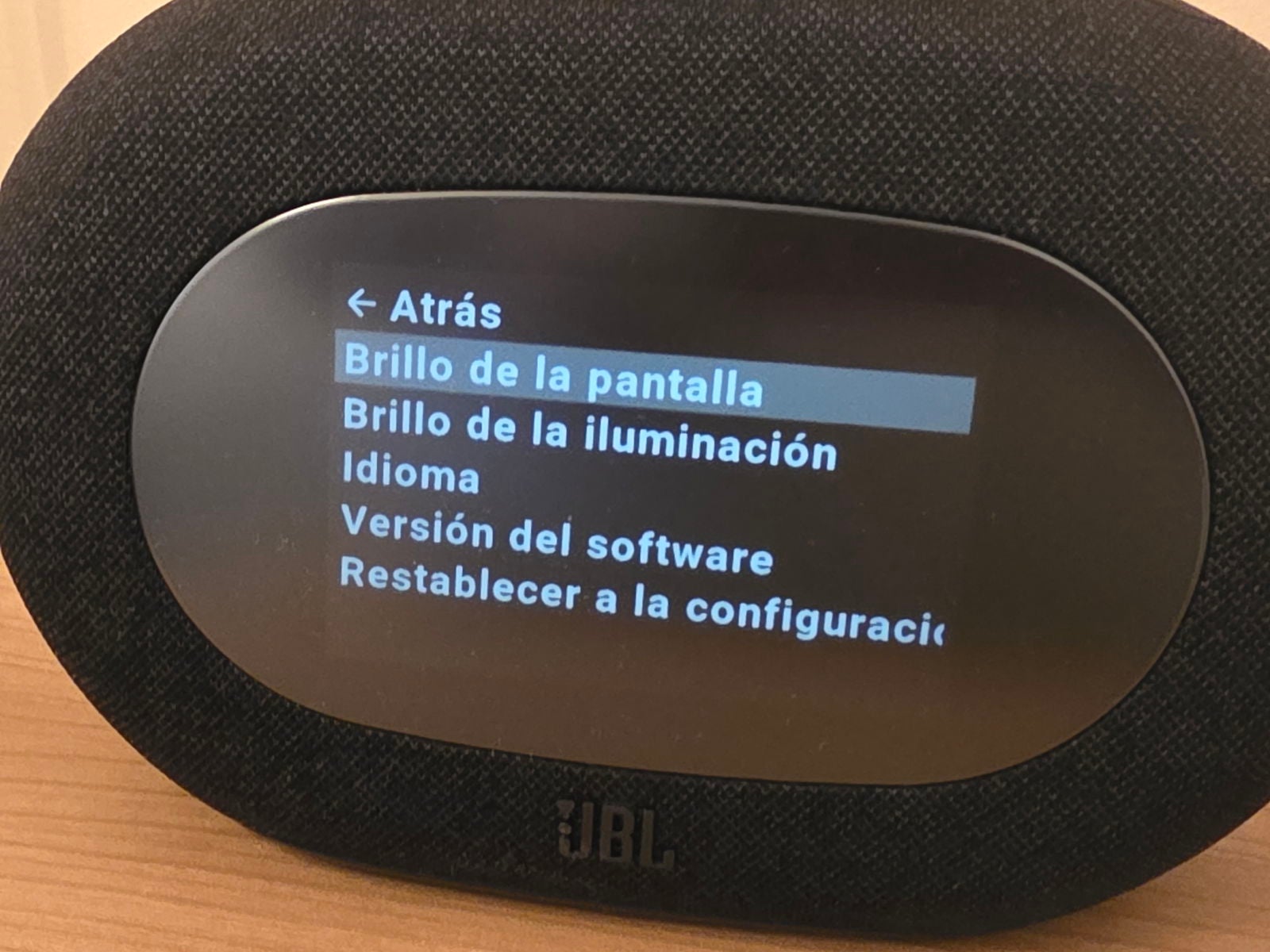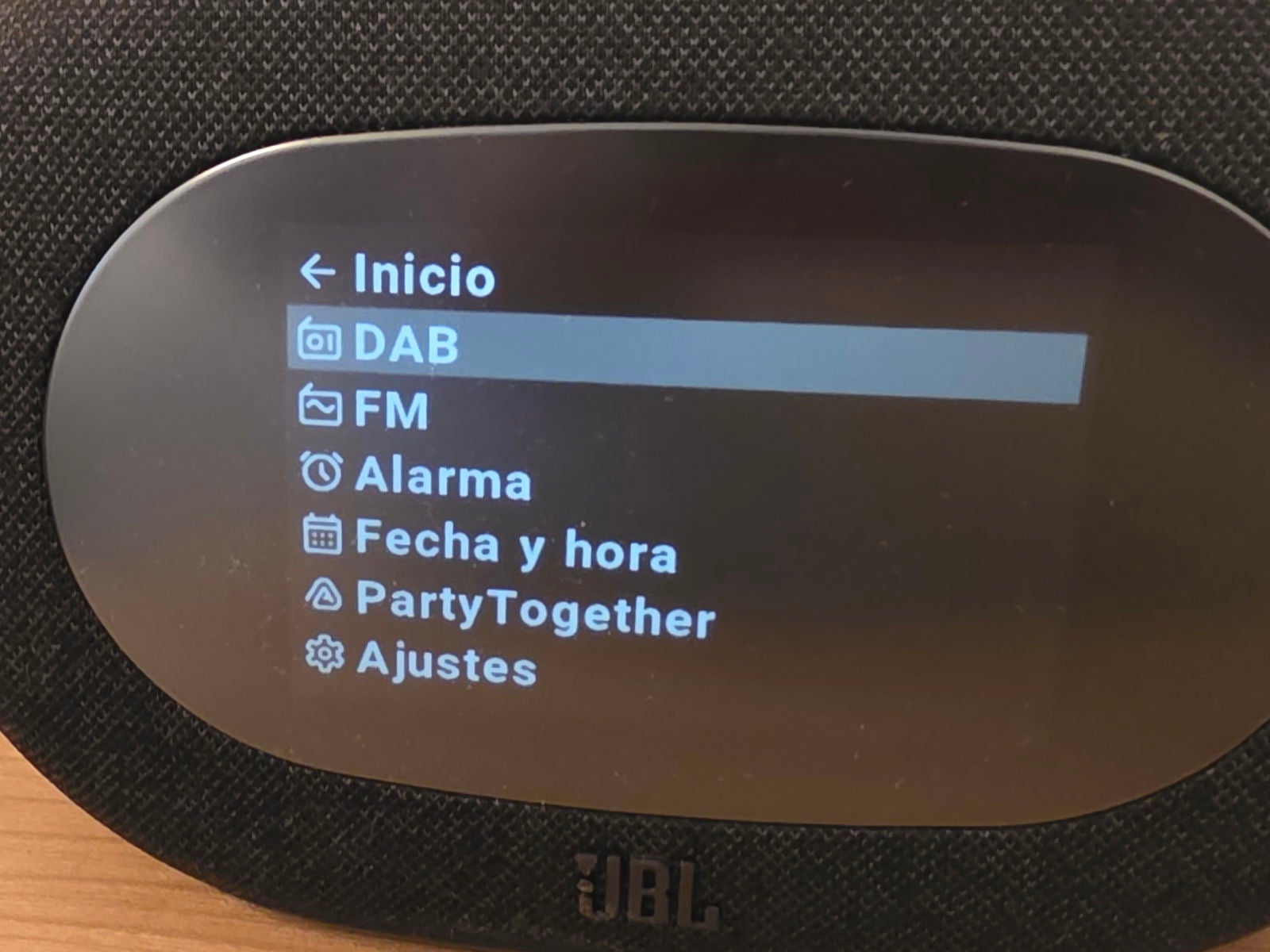 La pantalla integrada es todo un acierto de diseño. En lugar de tener una pantalla que destaque como un elemento extraño, JBL ha conseguido que se integre perfectamente en el conjunto gracias a ese acabado esmerilado que suaviza la luz y evita esos destellos molestos cuando estás intentando dormir. La información se ve perfectamente: hora, fecha, emisora de radio o el estado de la conexión Bluetooth, todo sin resultar agresivo para la vista. En la parte superior encontramos los controles físicos estratégicamente colocados, con ese botón central prominente que actúa como controlador principal y que, la verdad, se nota sólido y responde fenomenal incluso cuando lo tocas a oscuras.