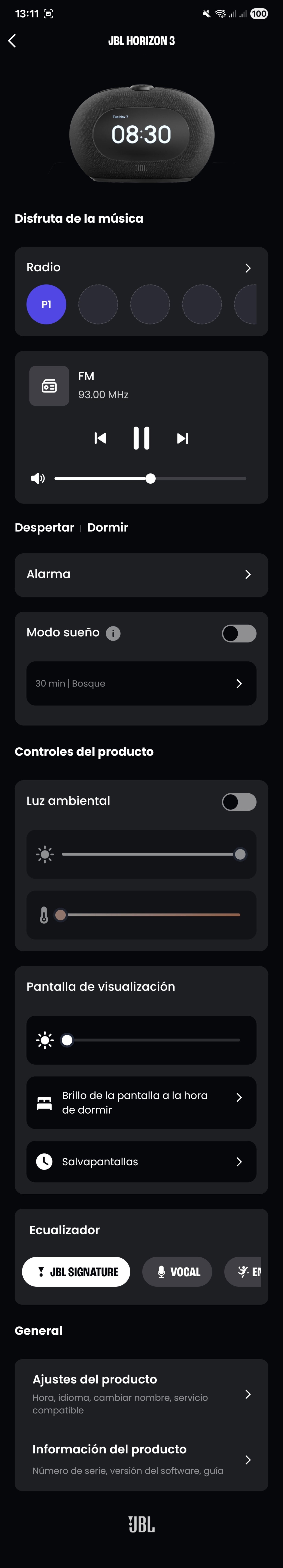 Dicho esto, la experiencia de uso general es muy buena. Ya sea con JBL One, u operando el radiodespertador a través de los botones, todo funciona correctamente. Una vez dejas el aparato configurado, hará justamente lo que le pides. En mi caso particular, las alarmas saltan a la hora que tienen que hacerlo y la pantalla se apaga durante las horas de sueño para que no moleste durante la noche. Lo dicho, buen funcionamiento general.