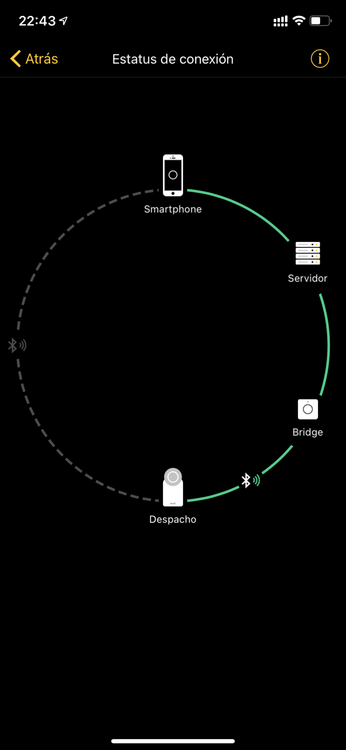 Es decir, yo ahora la tengo instalada en la oficina. Pues cuando estoy llegando a donde tengo el despacho y gracias al GPS, Nuki sabe que estoy cerca de la puerta. Ahora bien, no es hasta que salgo del ascensor y me pongo al alcance del bluetooth de la Smart Lock cuando la puerta se abre automáticamente, sin necesidad de hacer ningún acción con el smartphone y por supuesto, sin llevar ninguna llave encima.