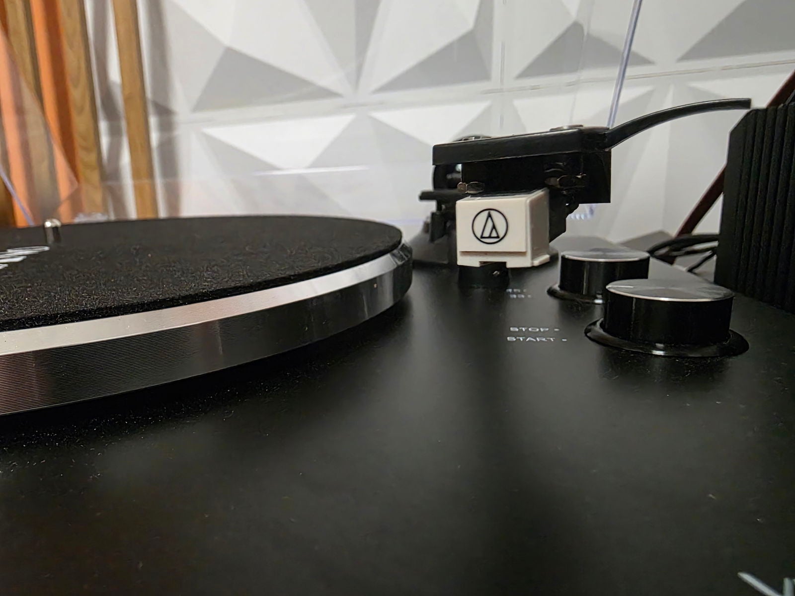 Volviendo a los controles manuales, en el plinto se sitúan la perilla de reproducción y la de selección de velocidad. Frente a los botones habituales en tocadiscos orientados a DJs —como los clásicos de Technics— aquí se opta por un selector de dos posiciones: se gira para poner el plato en marcha o detenerlo, y con la segunda perilla se elige la velocidad adecuada para cada disco.