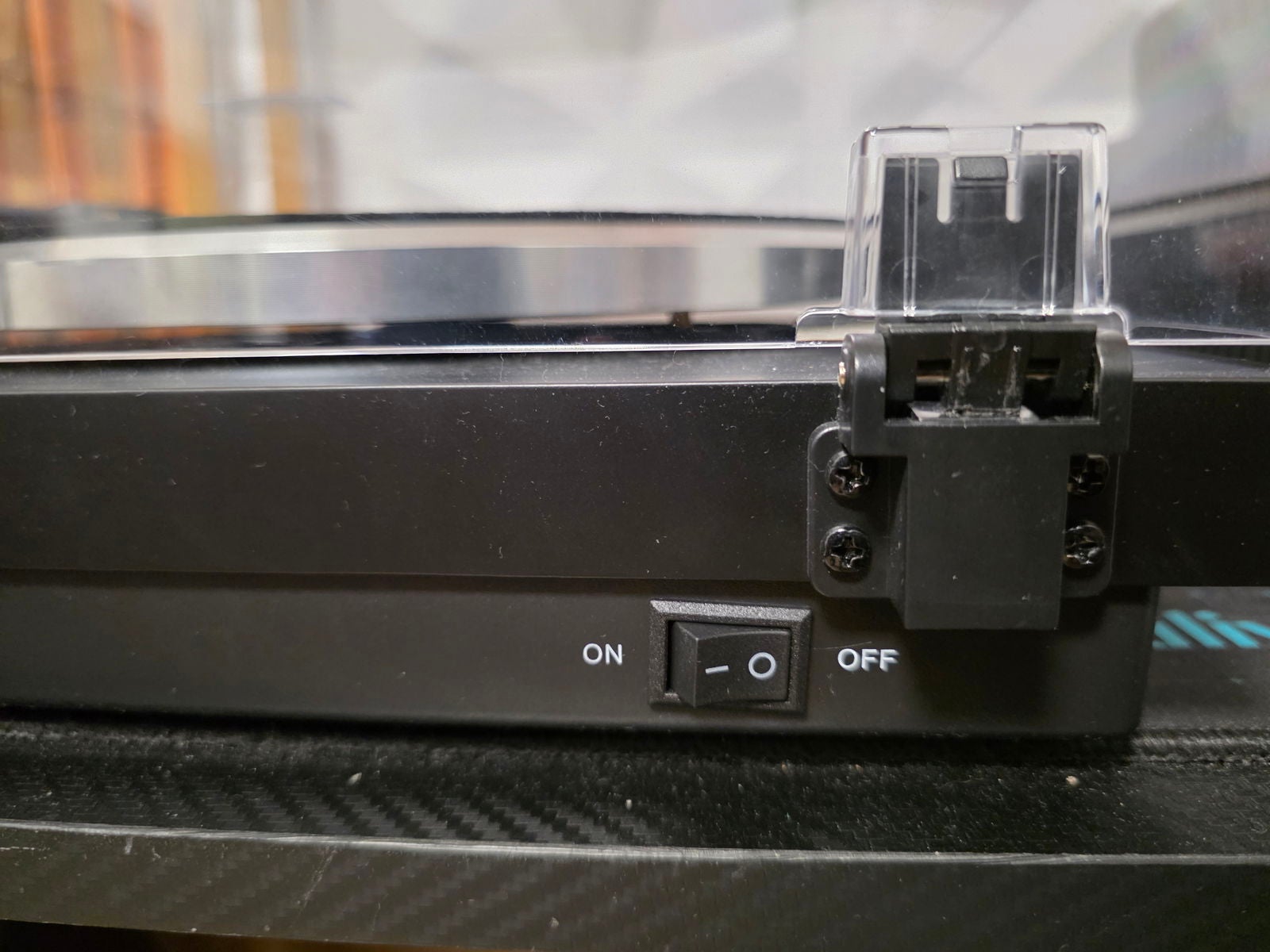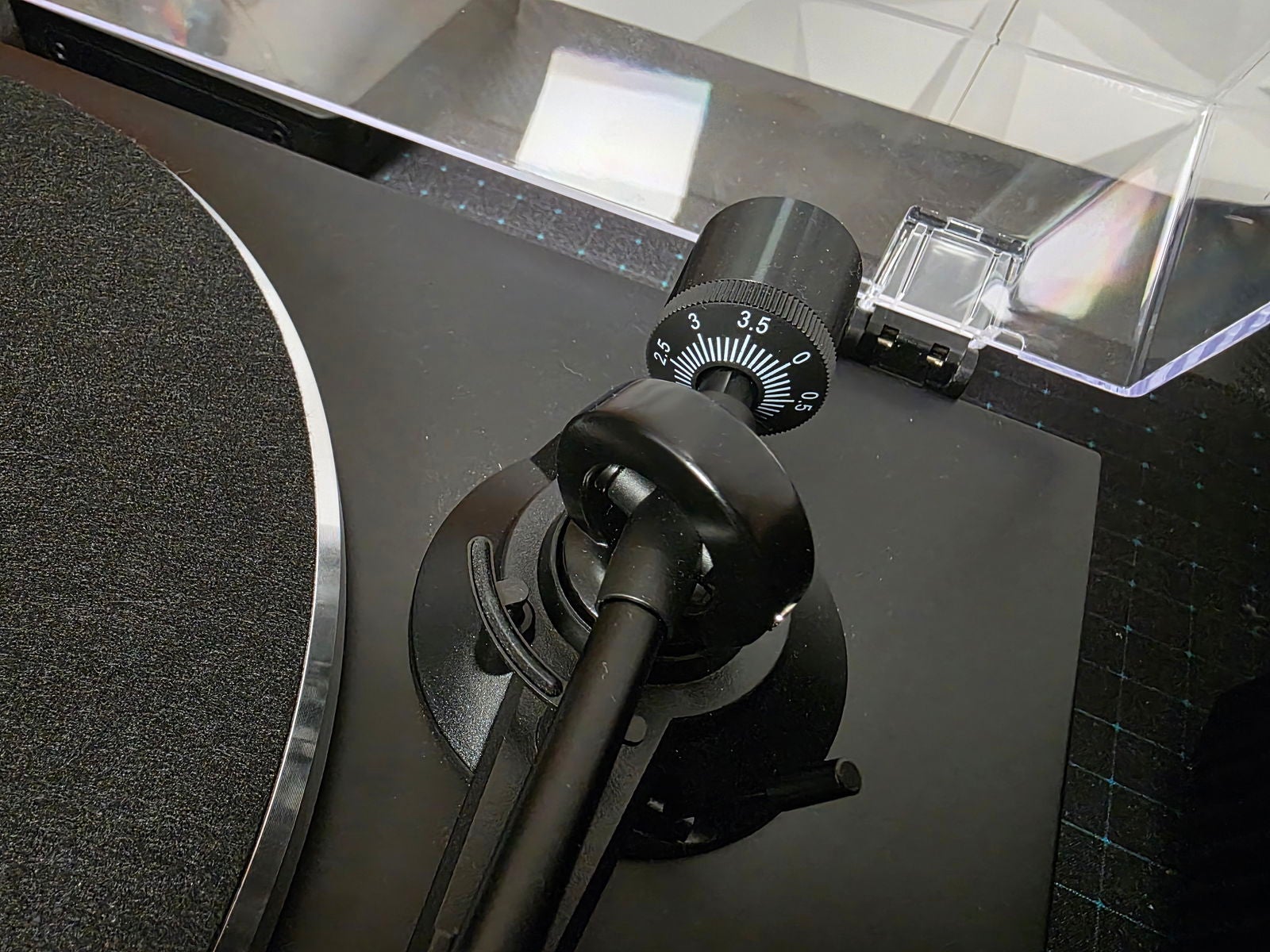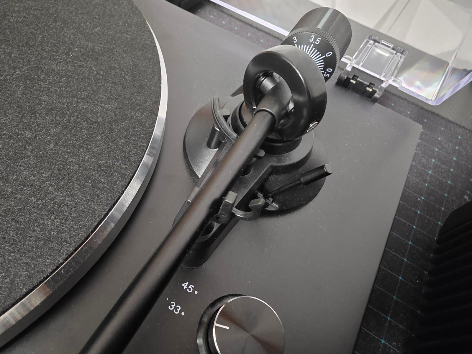 Junto a estos controles aparece la palanca de elevación del brazo, situada antes del contrapeso y del apéndice de la cápsula para posicionarla sobre el vinilo. Su recorrido es corto, lo justo para subir y bajar la aguja con precisión. La ejecución es correcta y transmite control; un recorrido mayor probablemente habría aumentado el margen de error en lugar de mejorar la experiencia.