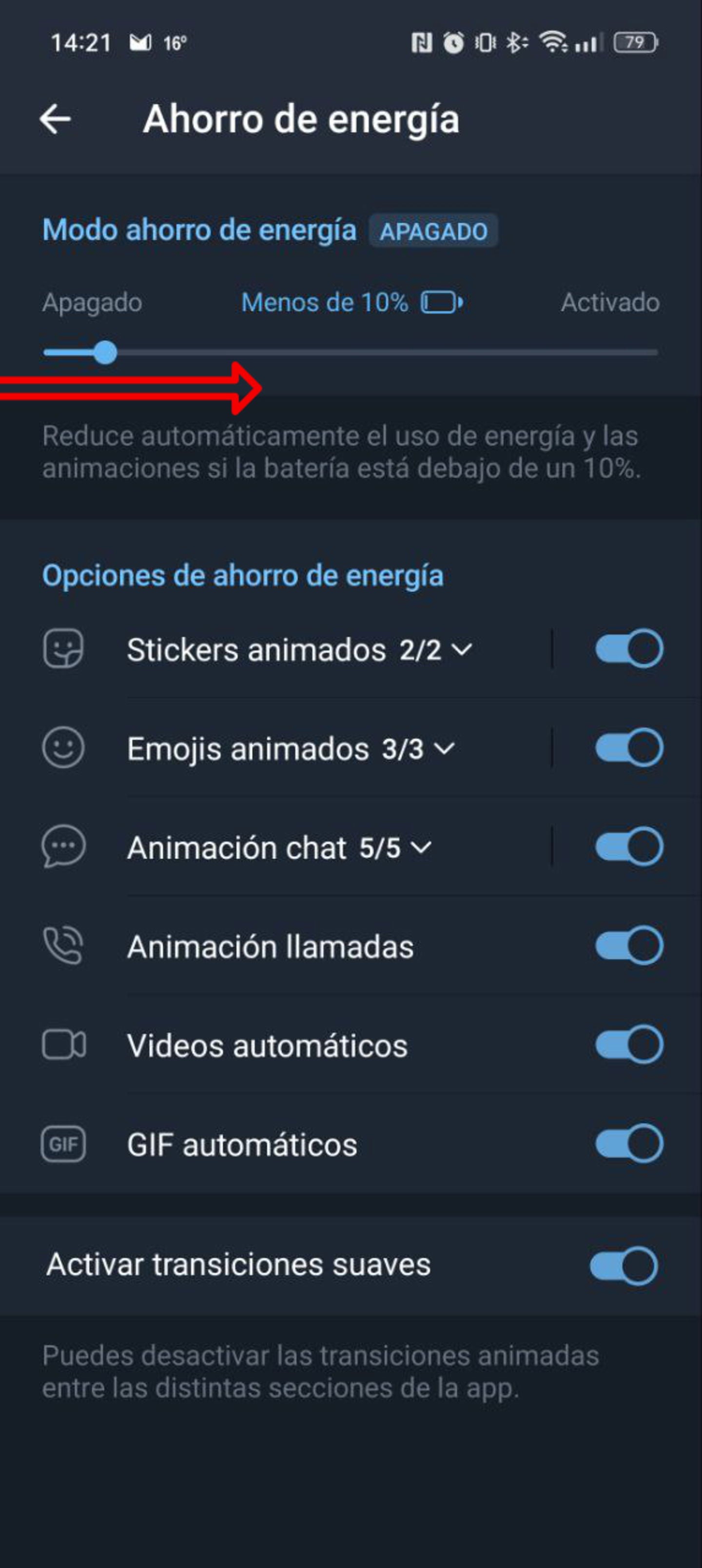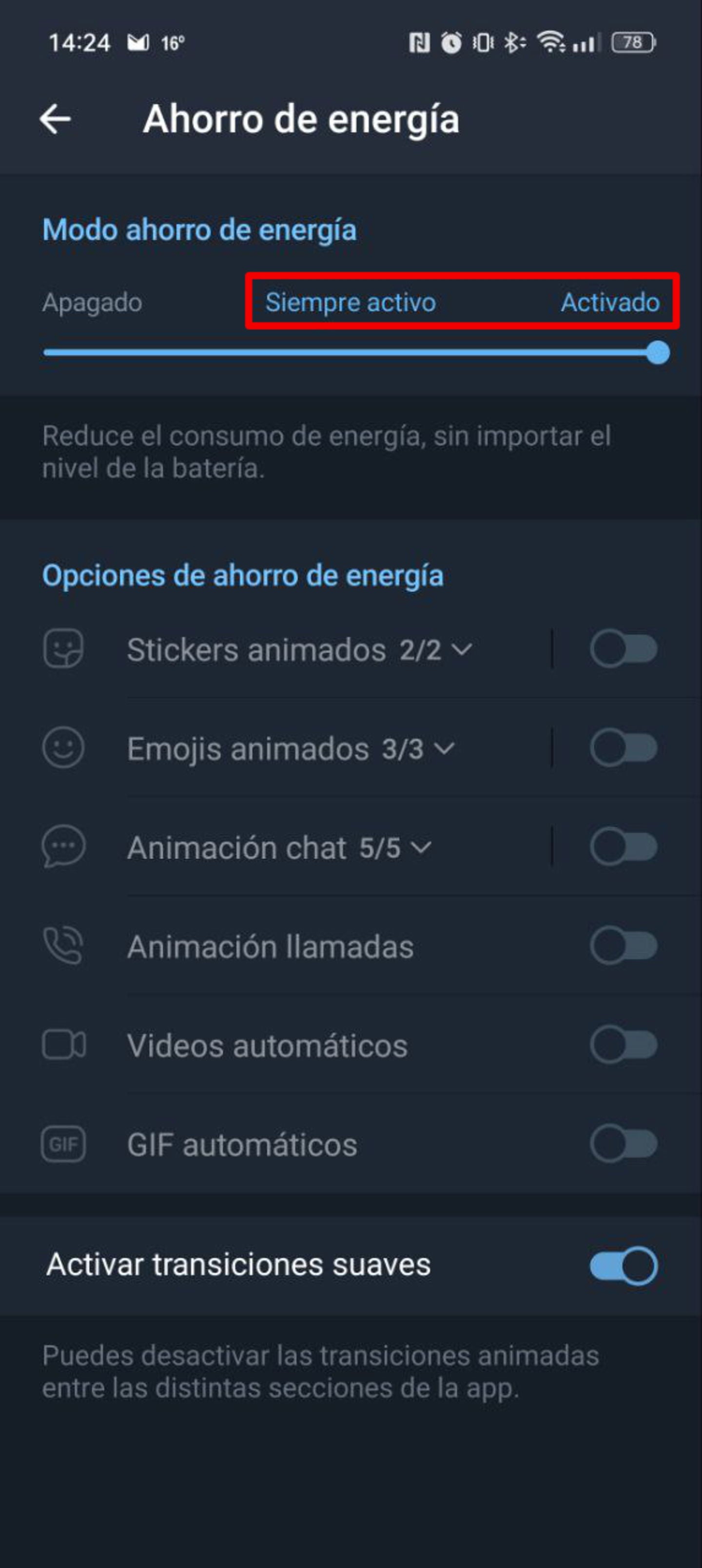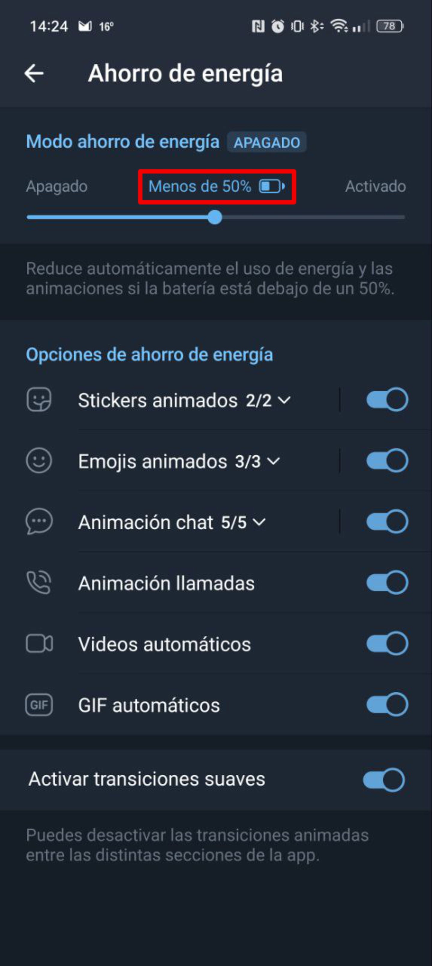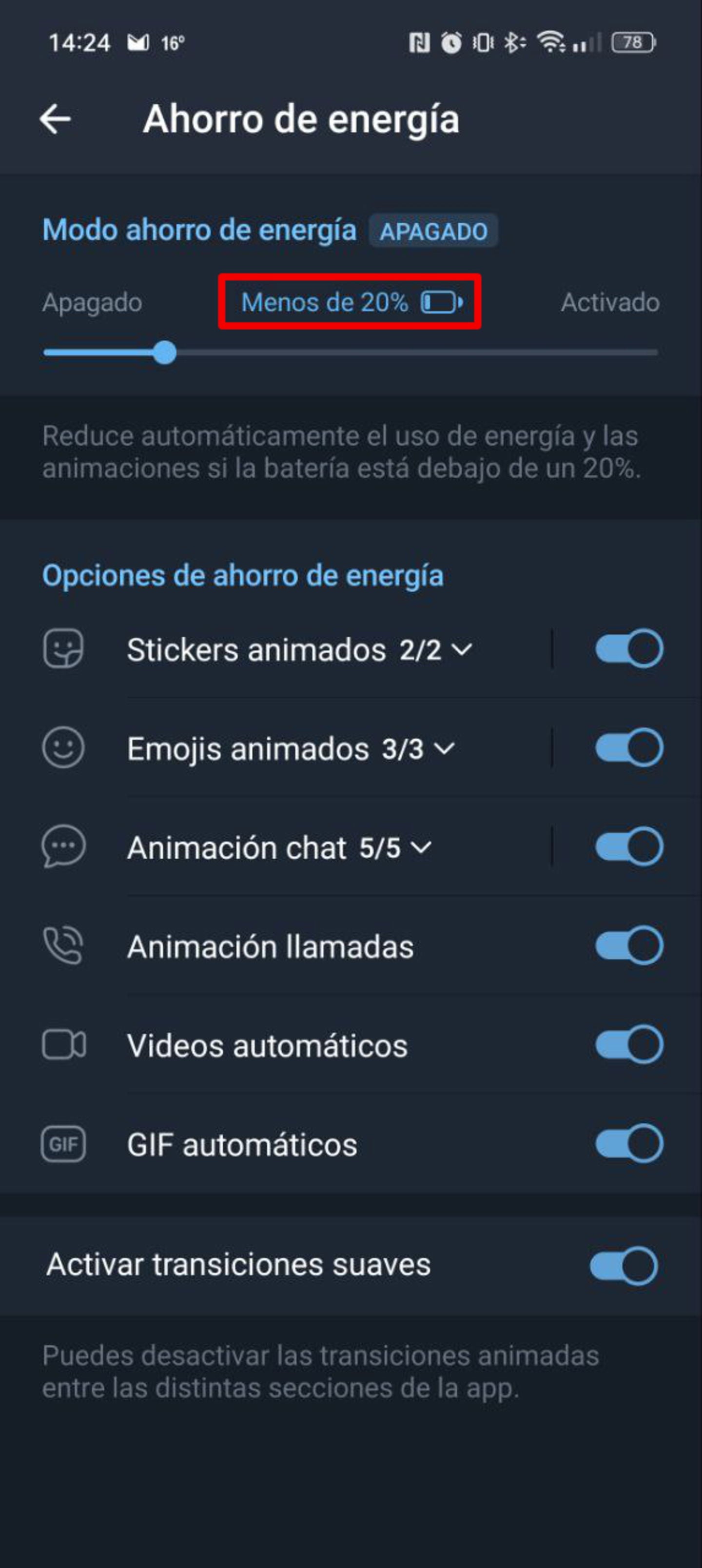 Así, una vez activado este modo, la aplicación de Telegram se encargará de desactivar, automáticamente, las funciones que estén marcadas para reducir su consumo y así aumentar la autonomía del dispositivo.
