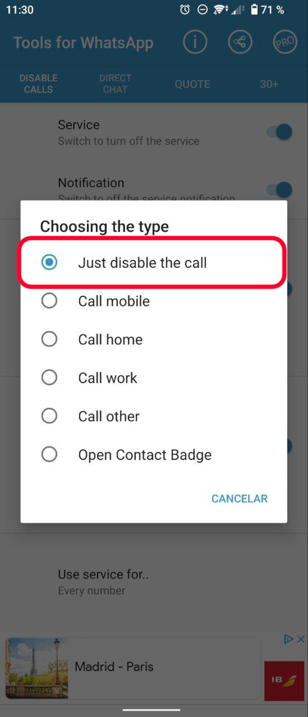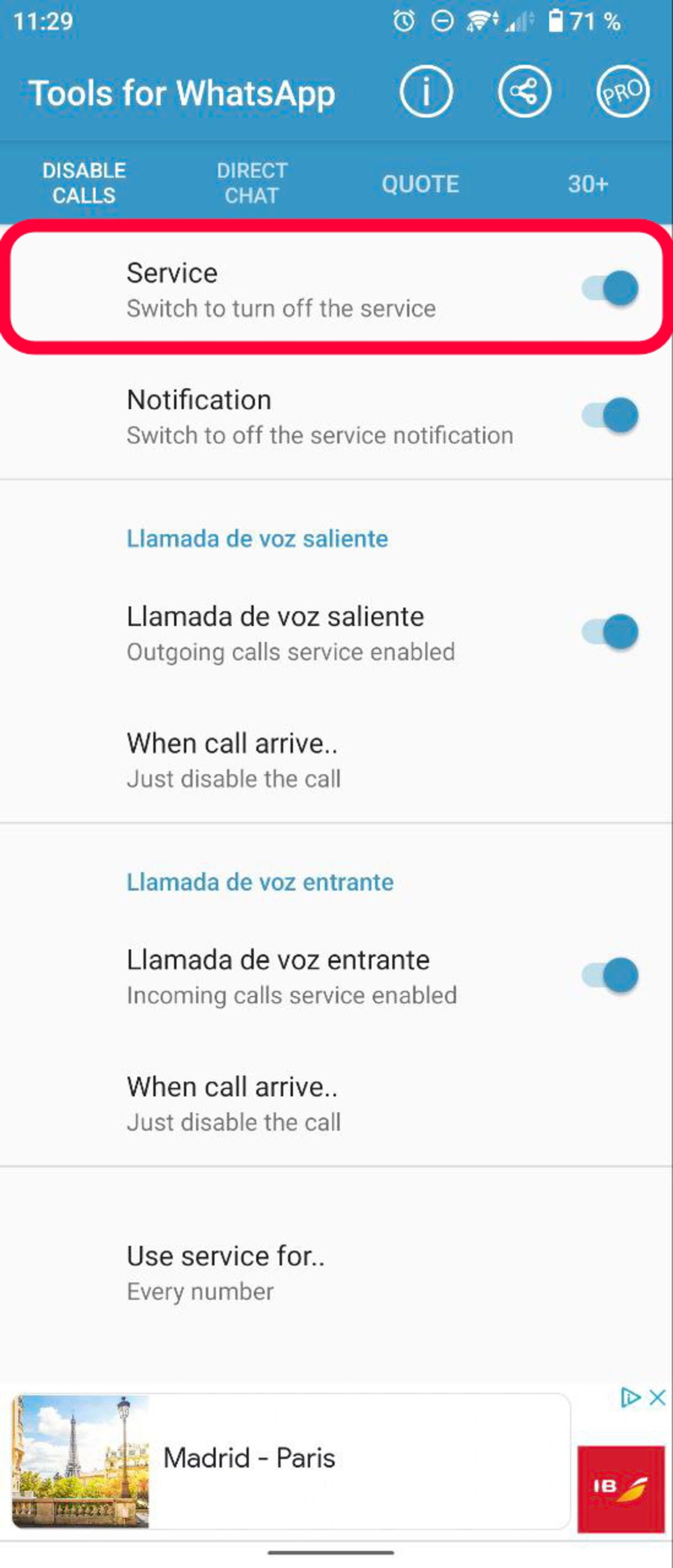 Dentro de la pestaña "Disable Calls", activa la casilla "Service". Es ahí cuando habilitarás la desactivación de llamadas, aunque puedes elegir entre varias opciones de configuración. Si entras en "Llamada de voz entrante", verás que puedes elegir si quieres rechazarla directamente ("Just disable the call") o desviarla a otros números de teléfono.