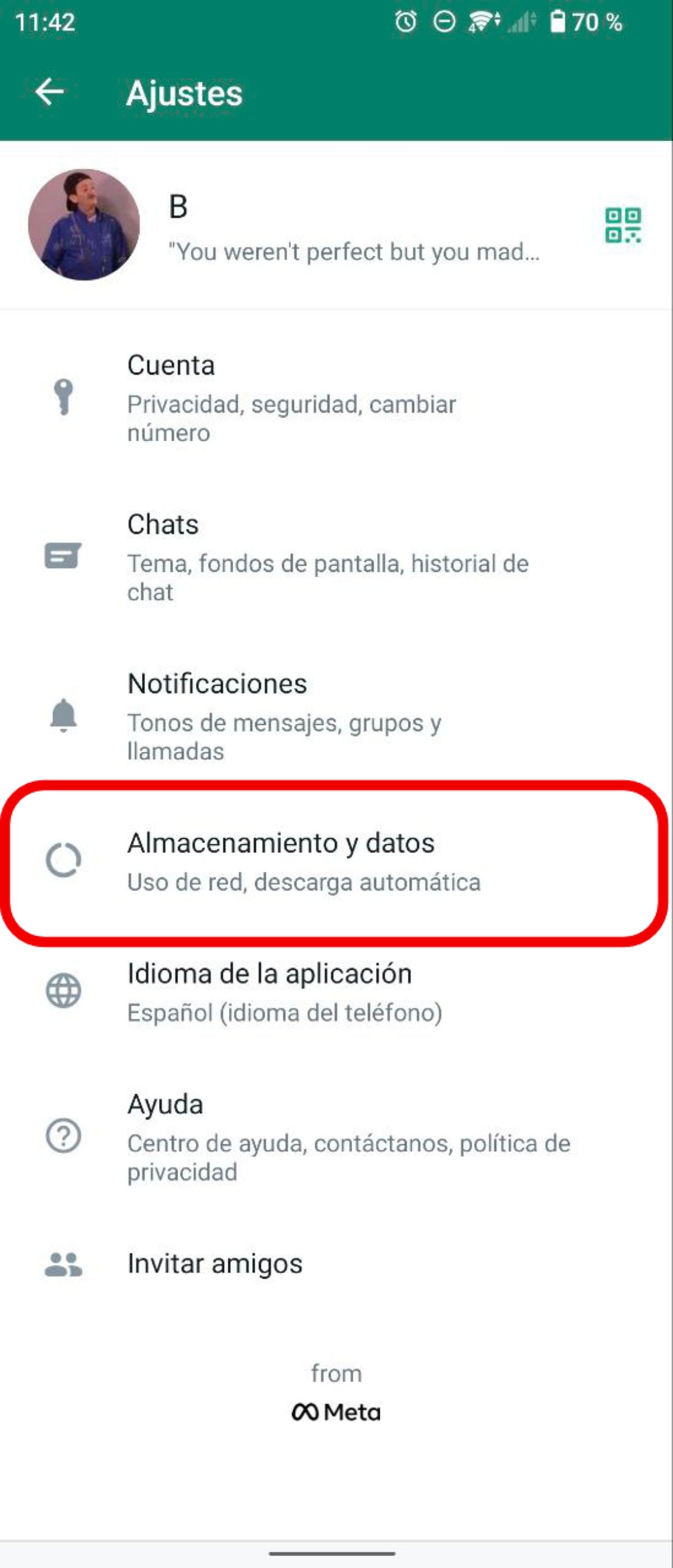 - Toca sobre "Ajustes" y, desde ahí, accede al apartado "Almacenamiento y datos".