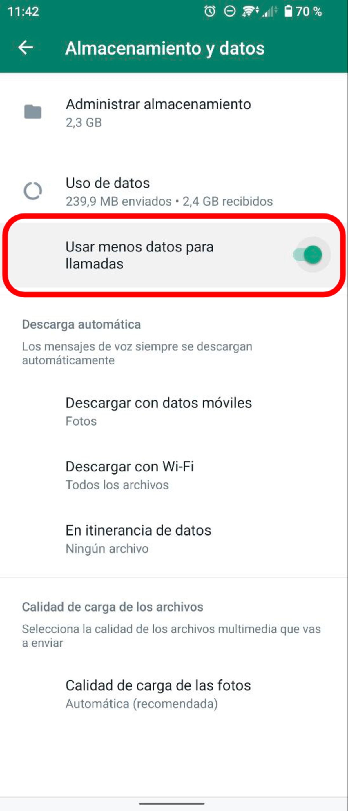 La última opción que puedes utilizar para bloquear las llamadas y videollamadas de WhatsApp se encuentra dentro de la propia aplicación. Nos referimos a "Usar menos datos para llamadas", que te permite limitar el uso de datos móviles que se consumen mientras haces una llamada, ya sea de audio o de vídeo.