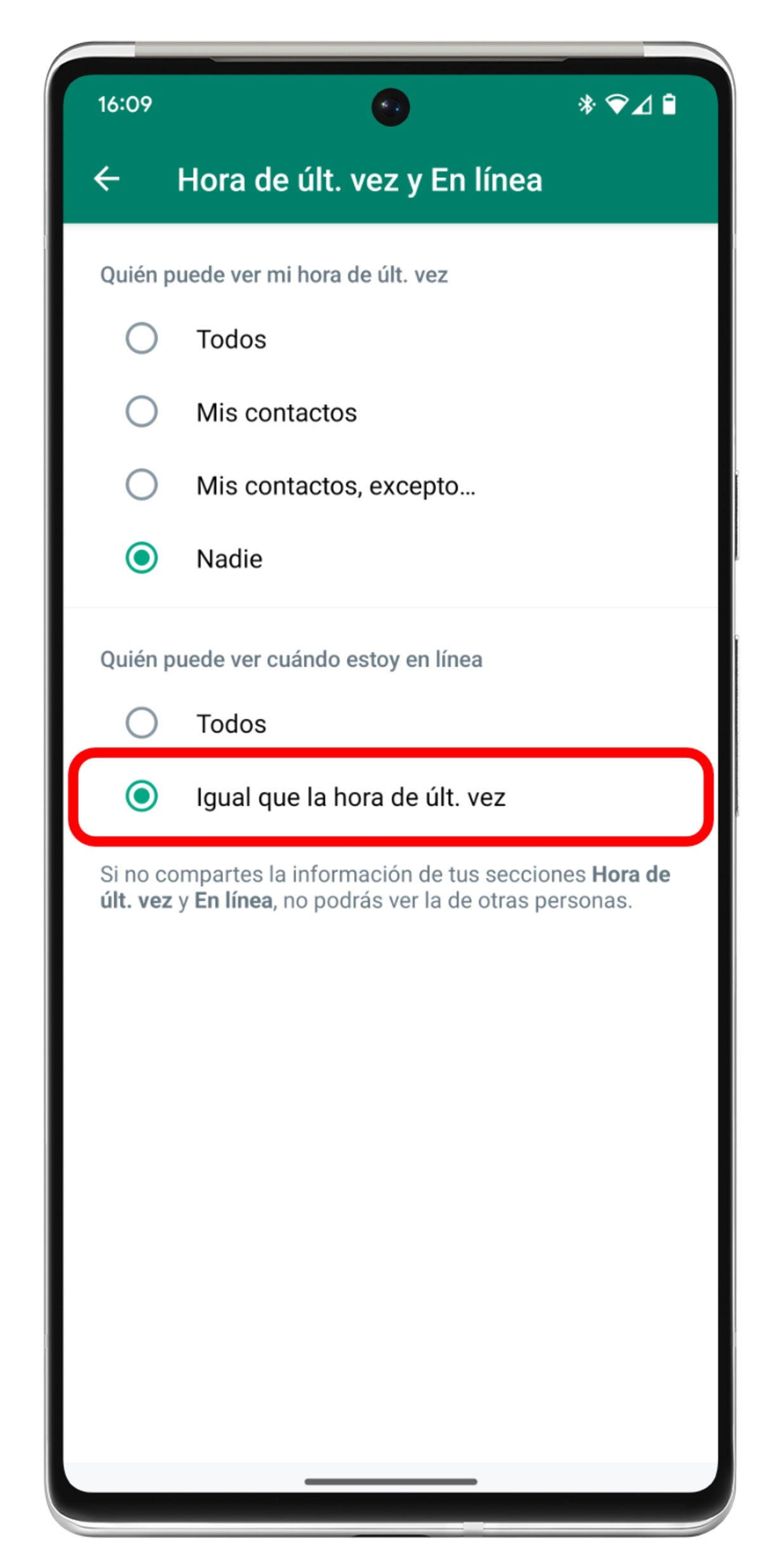- Si no quieres que nadie sepa que estás "En línea", elige la opción "Nadie" en el apartado "Quién puede ver mi hora de últ. vez", y la opción "Igual que la hora de últ. vez" en el apartado "Quién puede ver cuándo estoy en línea".