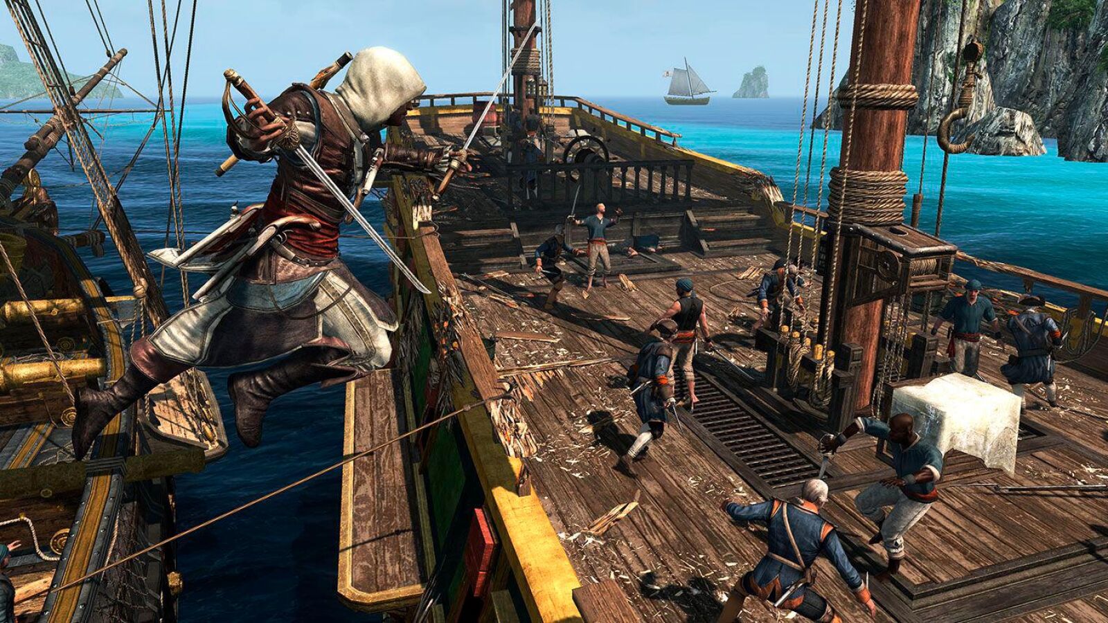 En Assassin’s Creed IV: Black Flag navegamos directos a la Edad de Oro de la Piratería. Asumiendo el rol de Edward Kenway, el capitán pirata más temido del Caribe, nos veremos arrastrados a una antigua guerra entre Assassins y Templarios. La entrega incluye todos los paquetes de contenido descargable para un jugador incluyendo ‘Aveline’ y ‘Grito de libertad’. El primero nos invita a jugar como Aveline, durante un período incierto y de descubrimiento interior, pero más comprometida que nunca con la defensa y la liberación de los esclavos. En ‘Grito de libertad’ Adewale, nacido esclavo, encuentra la libertad como pirata a bordo de la nave de Edward Kenway. Quince años más tarde se ha convertido en un eficaz Assassin cuya misión es liberar esclavos y vengarlos.
