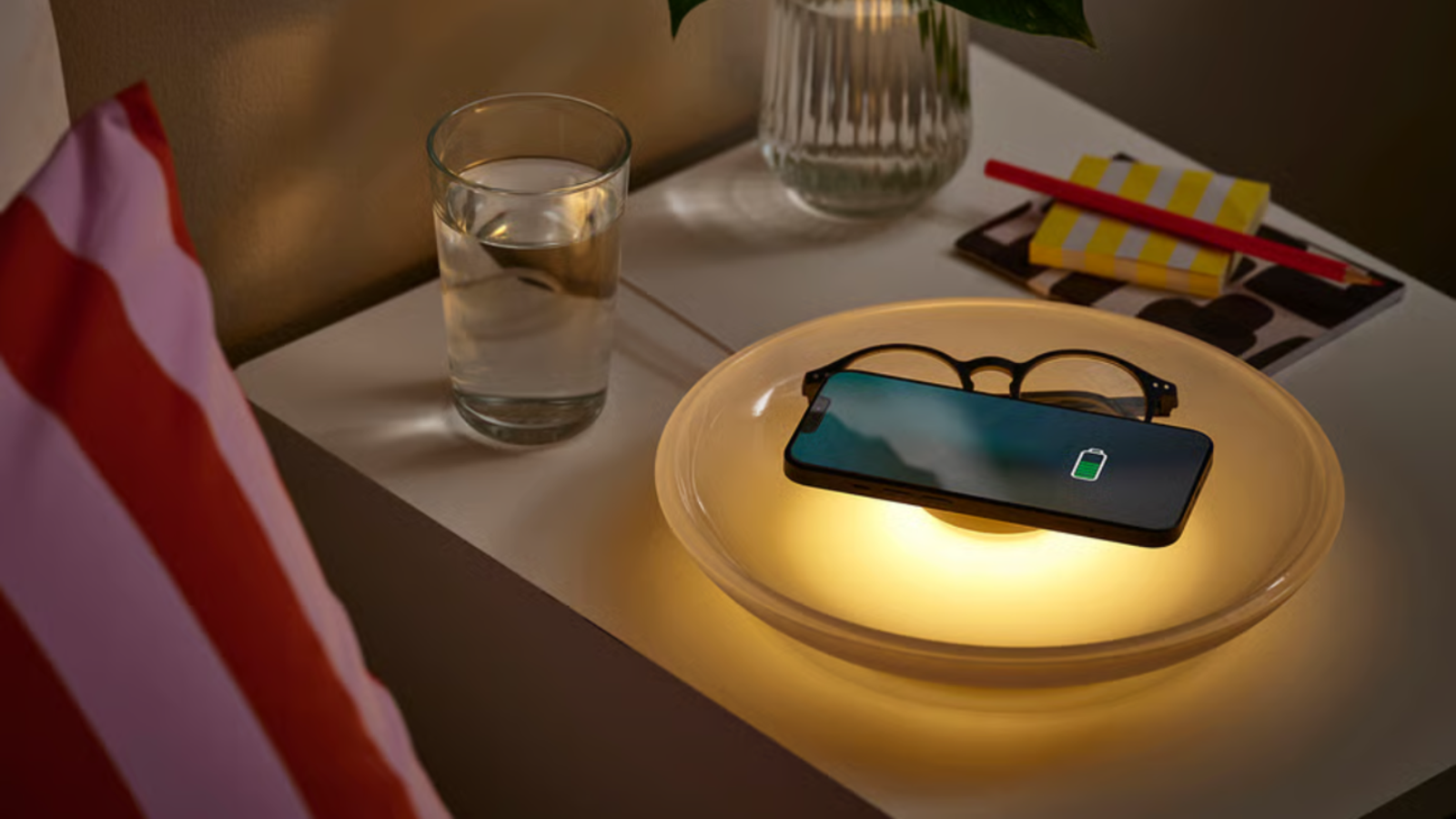 El tercer dispositivo es el más "IKEA" de todos, en el mejor sentido, porque es el más interesante a nivel concepto. No es solo un cargador: es una bandeja organizadora con luz ambiental integrada. Su diseño en forma de cuenco permite dejar dentro pequeños objetos cotidianos, como joyas, las llaves o el reloj, mientras el móvil se carga en la parte superior.