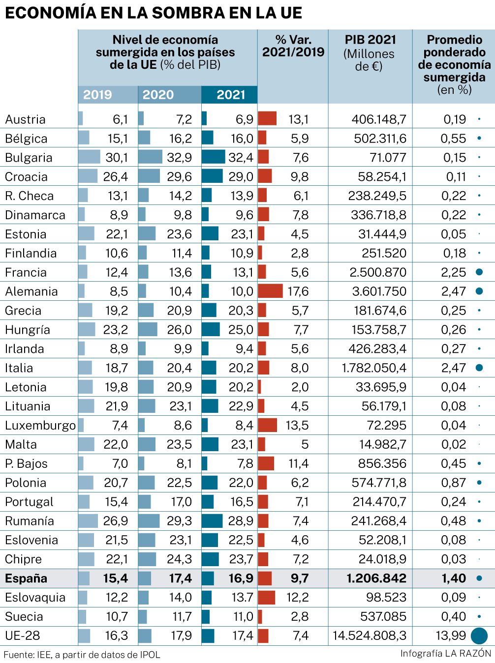 IPOL, tal y como advierte en su informe, ha realizado una media aritmética, la cual no ofrece una radiografía del todo exacta de los niveles de economía sumergida. Por ello, el Instituto de Estudios Económicos (IEE) ha realizado un análisis más preciso. Así, tomando como referencia estos datos comunitarios, ha calculado la media ponderada, es decir, teniendo en cuenta el peso de cada economía sobre la totalidad del PIB de la UE, y el resultado, tras realizar este ejercicio, es que la economía sumergida en el conjunto del PIB comunitario se reduciría hasta el 14%.