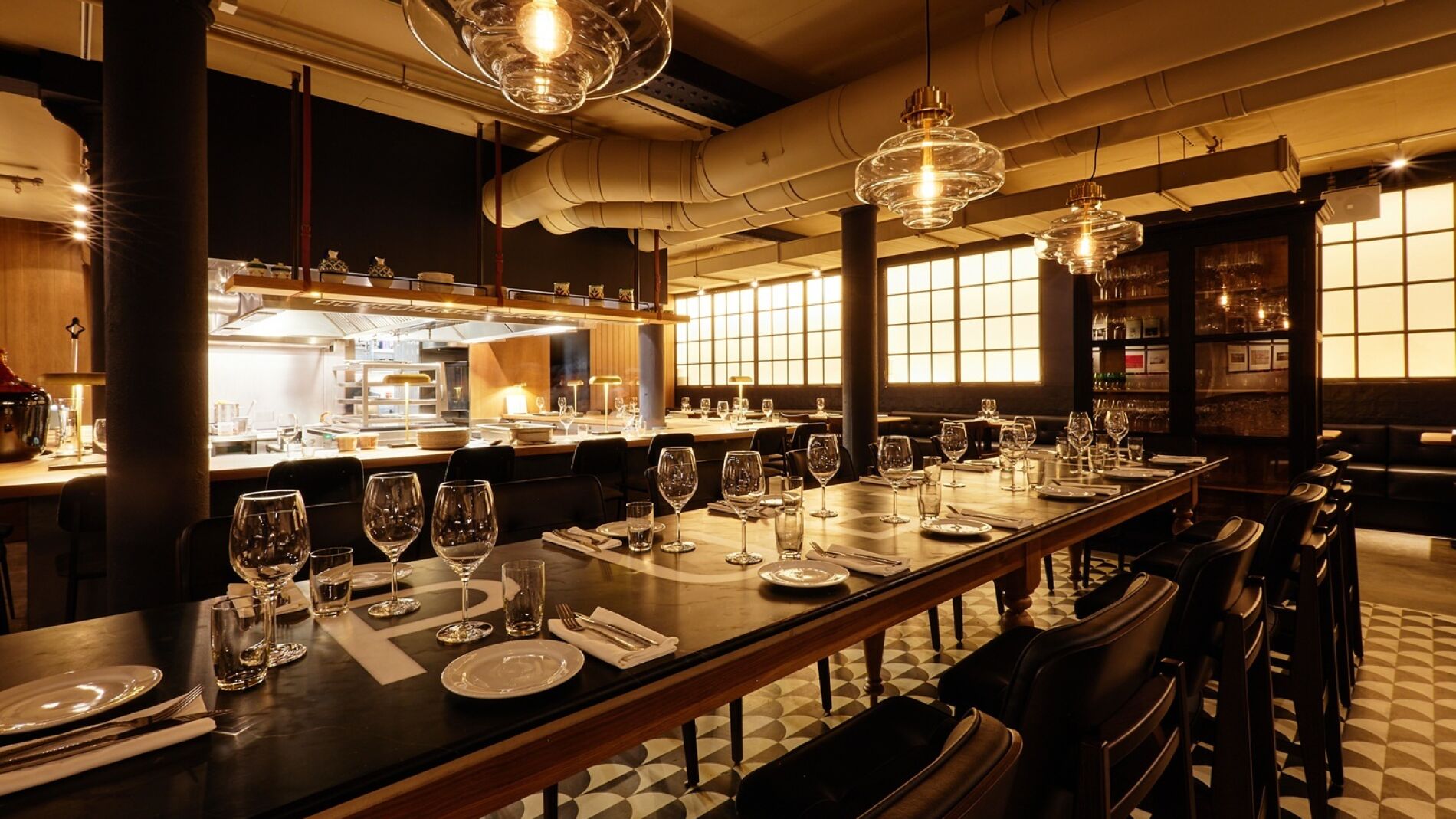 Ubicado en un antiguo colmado del Eixample, el espacio de Público sorprende por sus dimensiones y elegancia. Tras descender apenas dos peldaños, el comensal se adentra en una taberna contemporánea dominada por una cocina abierta con mesa central, rodeada de mesas redondas de mármol y rincones semiprivados. Entre los elementos más llamativos destaca un expositor de producto fresco, que recuerda a una lonja, con pescados y mariscos de temporada, verduras y hortalizas, además de un vivero con langostas y bogavantes. La propuesta se completa con una selección internacional de quesos, embutidos ibéricos, conservas premium y una colección privada de 30 botellas excepcionales —blancos, tintos y espumosos— que solo pueden consumirse en el restaurante.