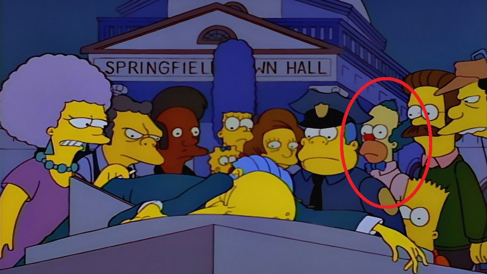 Esto podría poner la investigación patas arriba. ¿Por qué Homer se disfraza de Krusty? ¿Oculta algo? Esta imagen acusaba directamente a Homer, pero el escritor Bill Oakley salió a explicar qué ocurrió en esa escena porque no fue algo intencionado. En ese momento, los vecinos de Springfield presencian cómo Burns se desploma después de ser herido. Los guionistas no querían que estuviera Homer para que fuera uno de los sospechosos principales. Sin embargo, si aumentas la imagen puedes comprobar que se trata efectivamente de Homer cuando entró en la escuela de payasos. Se aprecia sobre todo en la nariz y la forma de la barba, pero en cambio tiene el pelo de Krusty. ¿Qué ocurrió entonces?