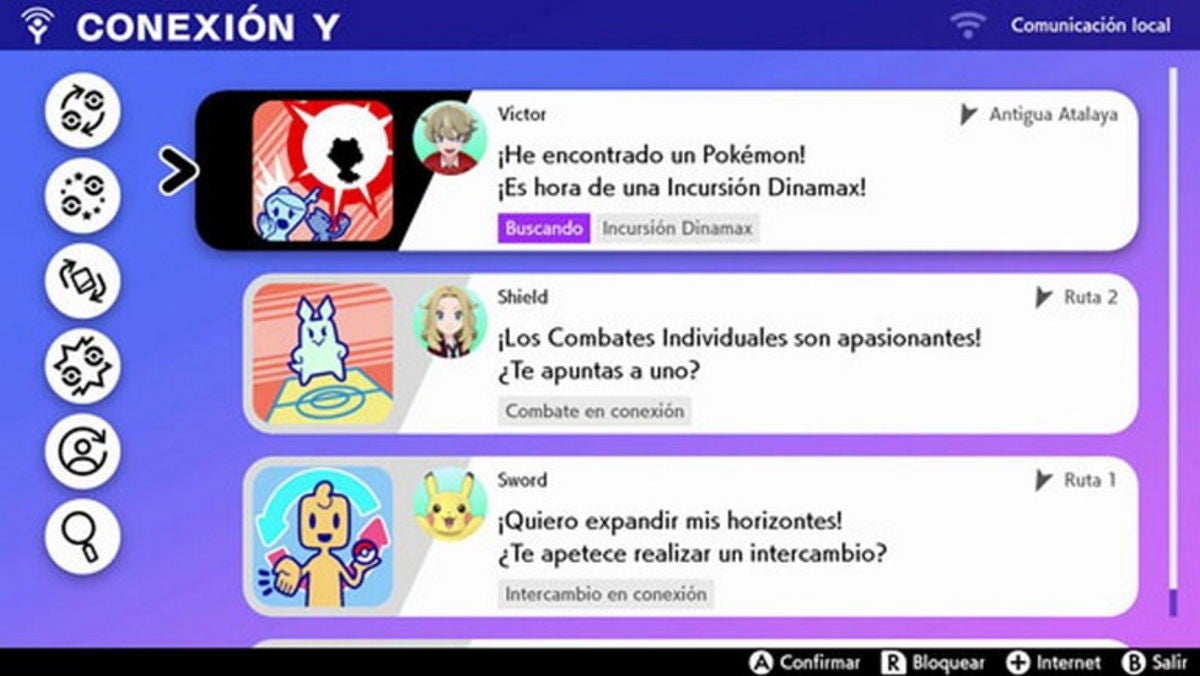 La otra clave para participar en las incursiones Dinamax es la Conexión Y. Esta, que se activa pulsando el botón del mismo nombre en la consola, permite a los jugadores tanto combatir como intercambiar criaturas con otros jugadores a través de internet o de la conexión local inalámbrica de Nintendo Switch. Una vez se activa, aparecen en la parte izquierda unos stickers con diferentes peticiones de los Entrenadores, de hecho, una de esas puede ser la búsqueda de ayuda para participar en estas Raid.